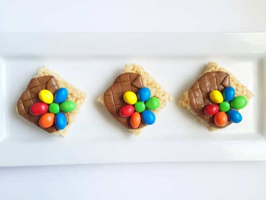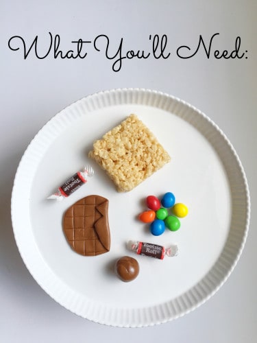 See! All you need are tootsie rolls, colored candies (I adore peanut M&Ms), and a rice crispy treat!