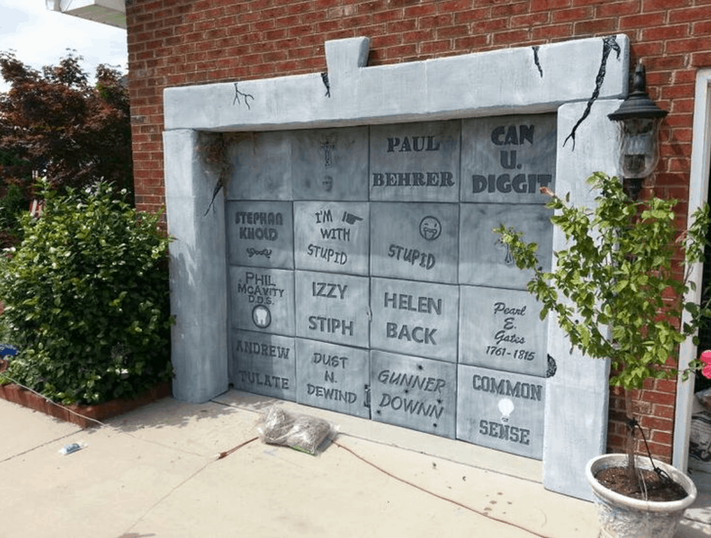 Honestly? I like this for Halloween! Especially the sign in the yard next to it! (I would add “and sales people” to the sign, personally). Would this scare children? I don’t think so, you can tell it’s a cartoony fake door.