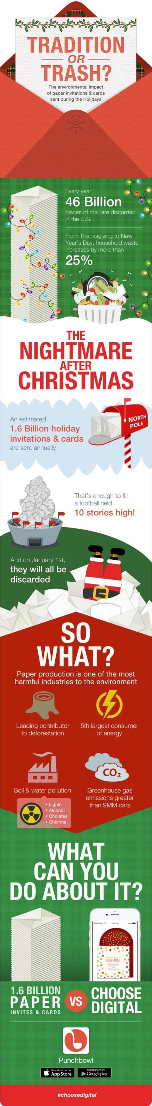 Want to learn more? Here’s a fantastic infographic created by Punchbowl that outlines the environmental impact of paper invitations and cards sent during the Holidays. Pin it and share it with your friends. Let’s make the holidays less wasteful and more sustainable.