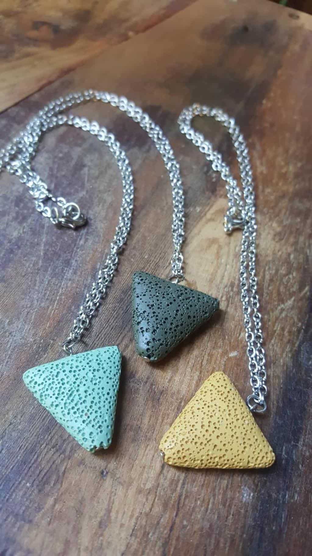 Half Moon Design Shop sells triangular lava stones in a variety of colors. Buy their necklaces today!