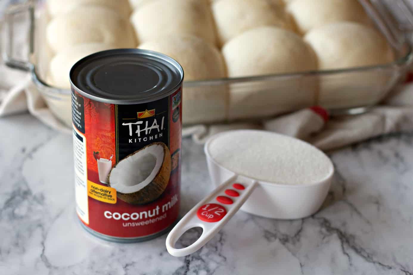 - In a medium mixing bowl, stir together the coconut milk and sugar until well combined. There may still be some very small bits of the coconut cream that does not full incorporate. This is okay and they will melt as the rolls bake.