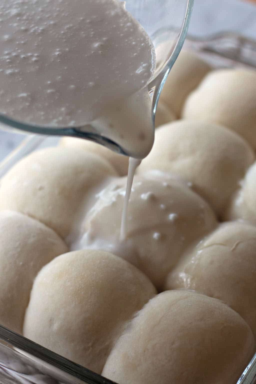 - Pour all of the sweet coconut milk mixture over top of the dinner roll dough. Be sure the tops of the dough are all evenly coated with the coconut milk.