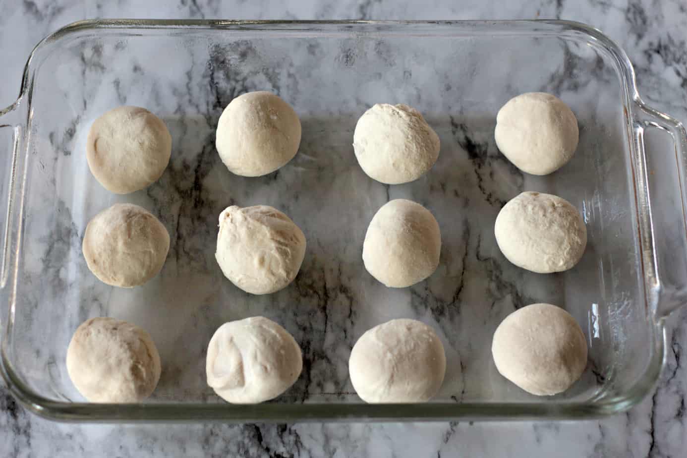 - Place the baking dish of dough balls in the oven uncovered and allow to thaw and rise until the dough balls have more than doubled in size; approximately 2 hours.