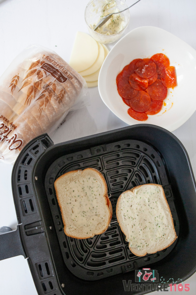 - Spread an even layer of seasoned butter on one slice of bread and place buttered side down in the air fryer.